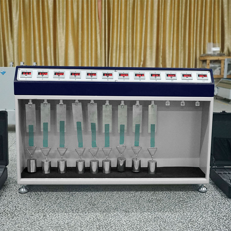 方法A:試樣在裁剪前,先去除最外的3-6層膠帶,裁剪最少3份12mm(或24mm)寬長約150mm的粘膠帶,試樣解卷后5分鐘內(nèi)粘試在驗(yàn)鋼板上,粘貼面積12×12mm²(或24×24mm²),用2kg±100的標(biāo)準(zhǔn)壓輥以10mm/s的速度來回輾壓三次,將不銹鋼三角環(huán)扣與試驗(yàn)鋼板對(duì)齊,使試樣自由端綁定在不銹鋼三角環(huán)扣上。試樣準(zhǔn)備好后在1分鐘內(nèi),將鋼板掛于試驗(yàn)儀測(cè)試位上,輕輕掛上砝碼,工位自動(dòng)開始計(jì)時(shí),當(dāng)粘膠帶自然脫落后,對(duì)應(yīng)砝碼模組的數(shù)顯累時(shí)器記錄保持時(shí)間,測(cè)試結(jié)束,人工記錄數(shù)據(jù)并綜合數(shù)據(jù)評(píng)定膠帶粘合的持粘性。